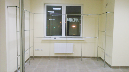 Оборудование для одежды. Торговая система хромированных труб наиболее часто применяется именно для изготовления конструкций под одежду. Конструкции для этих целей могут быть различными, наиболее же часто используются накопители и консоли. Накопители – это горизонтальные отрезки труб, прикрепленные к вертикальным стойкам. Между стеной и накопителем чаще всего делается интервал в 250мм. Расстояние от пола до первого уровня 1100мм, от первого до второго не менее 900мм и т.д. Вертикальные стойки так же, как и в случае со стеллажами, должны иметь интервалы не более 900мм, иначе под весом одежды накопители прогибаются, а крепежные узлы (зависит от их типа) могут проседать (опускаться по вертикальным стойкам). Консоли – это труба размером порядка 400мм с изгибом и 8-12 ограничителями на длинной части. Она при помощи специального крепежа монтируется к вертикальным стойкам или двойным горизонтальным (две параллельно идущие трубы). На консоли размещается одежда, которая “лицом к покупателю”. Между консолями должно быть расстояние не менее 550мм.